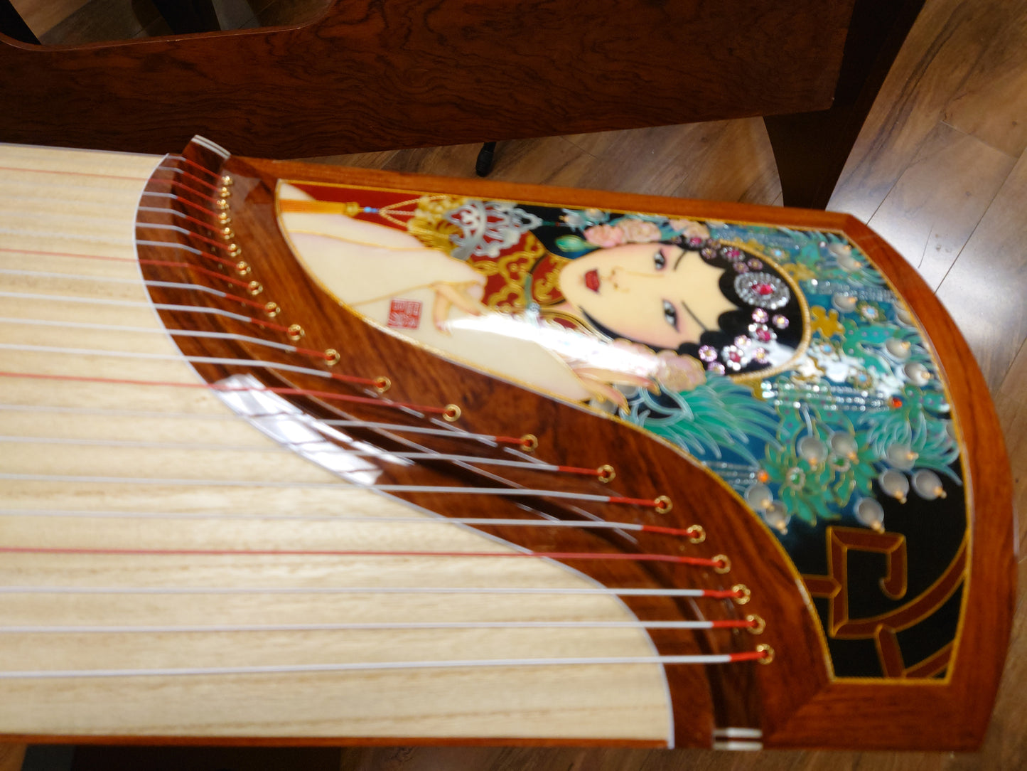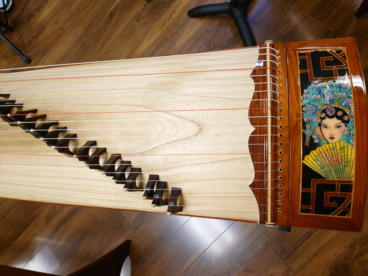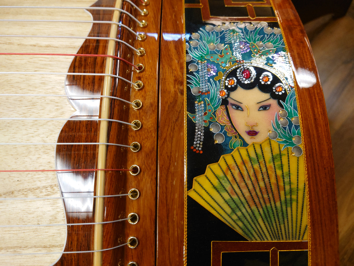 The guzheng is beautifully hand-decorated with a Cloisonné pattern in "The Drunken Beauty" design, making it a true work of art.